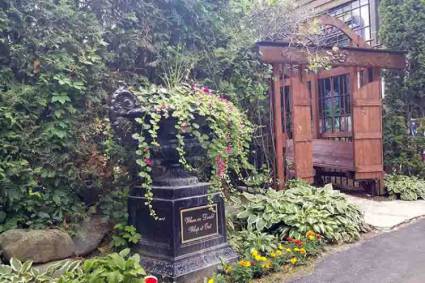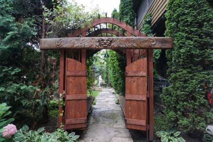 Along the driveway, there will be two inscribed large plant urns and a hand-crafted wood-gated seating area with a water fountain at the end.