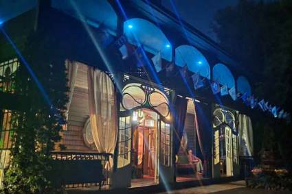 Exiting your vehicle will be greeted by large hand-crafted french doors and stained glass wall seating areas on each of a wide entrance area all protected by stained glass awning across the front of Adeline’s to welcome you.